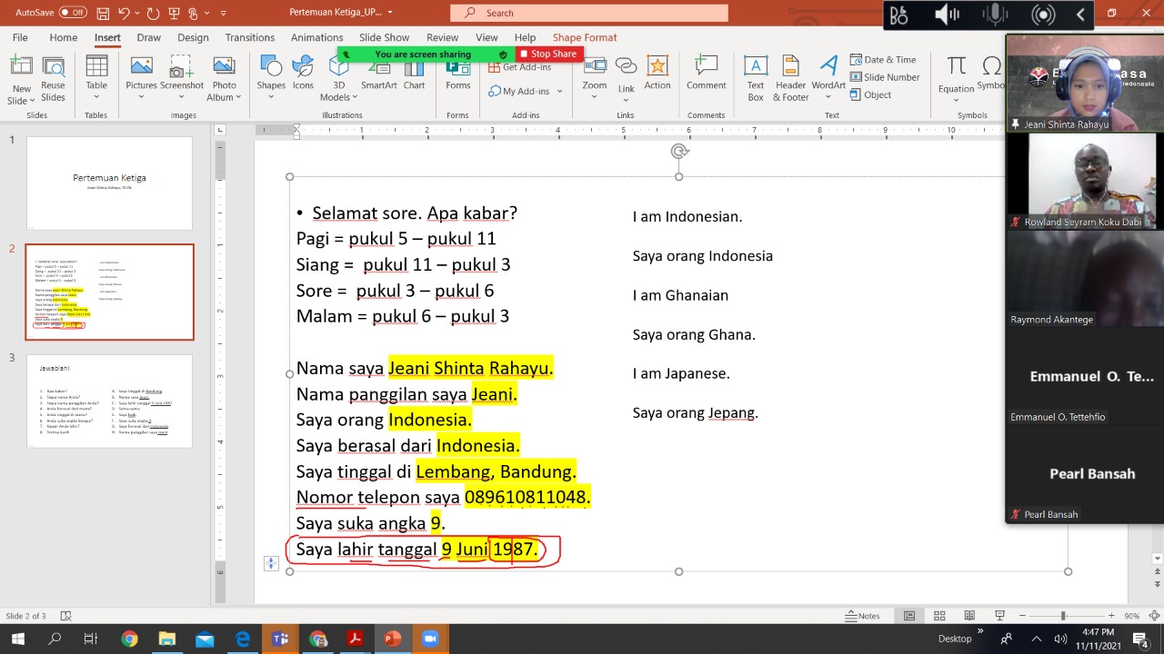 Pembelajaran BIPA bersama penerima beasiswa UPI Scholarship tingkat BIPA 1 dan BIPA 3.