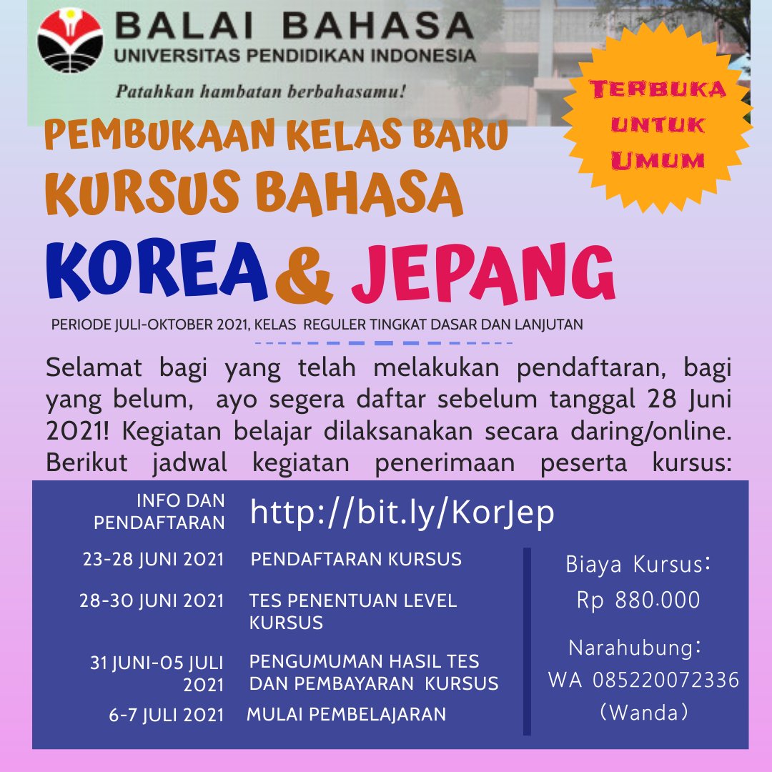 Balai Bahasa UPI membuka kursus daring bahasa Korea dan Jepang periode Juli 2021. Informasi selengkapnya ada pada tautan berikut: bit.ly/KorJep