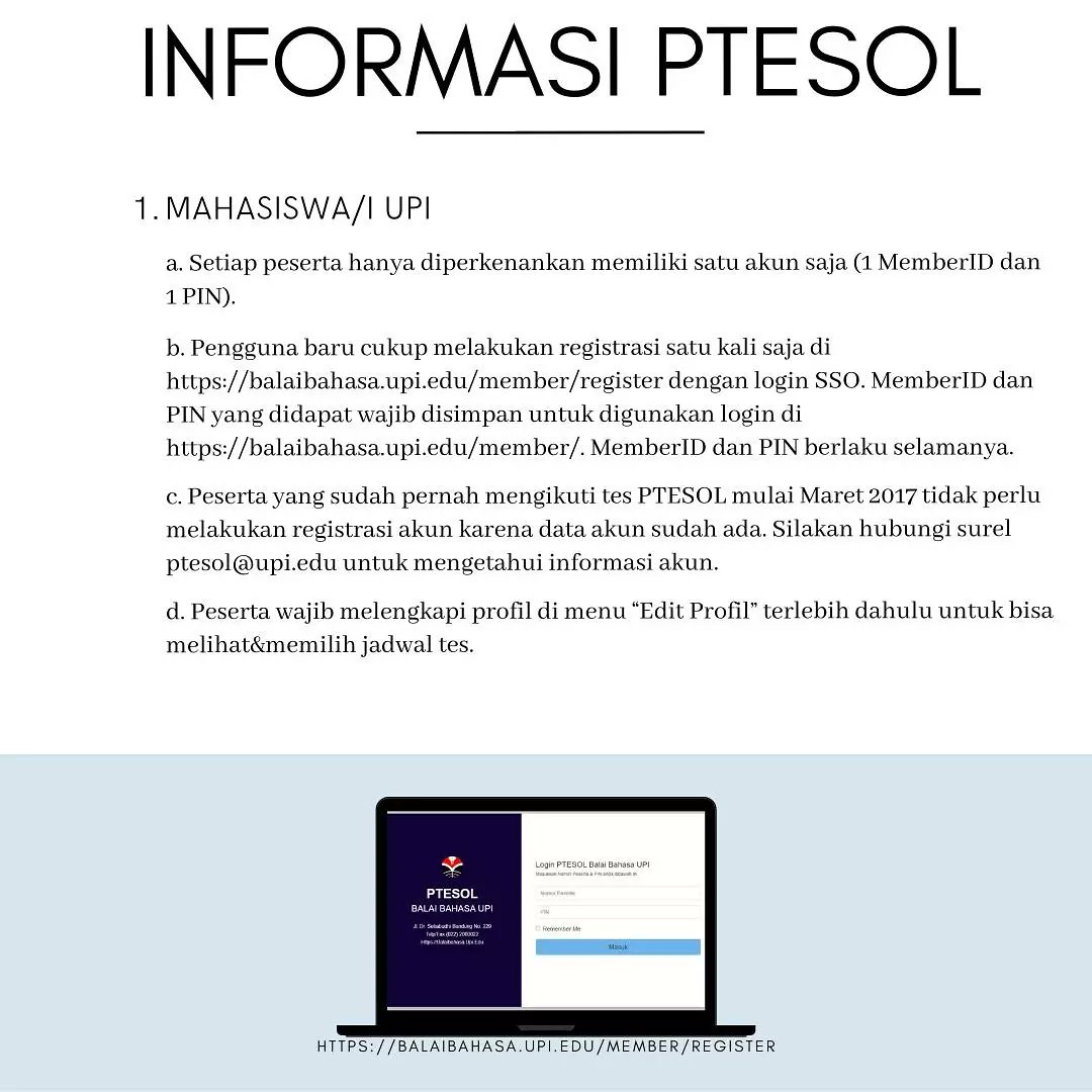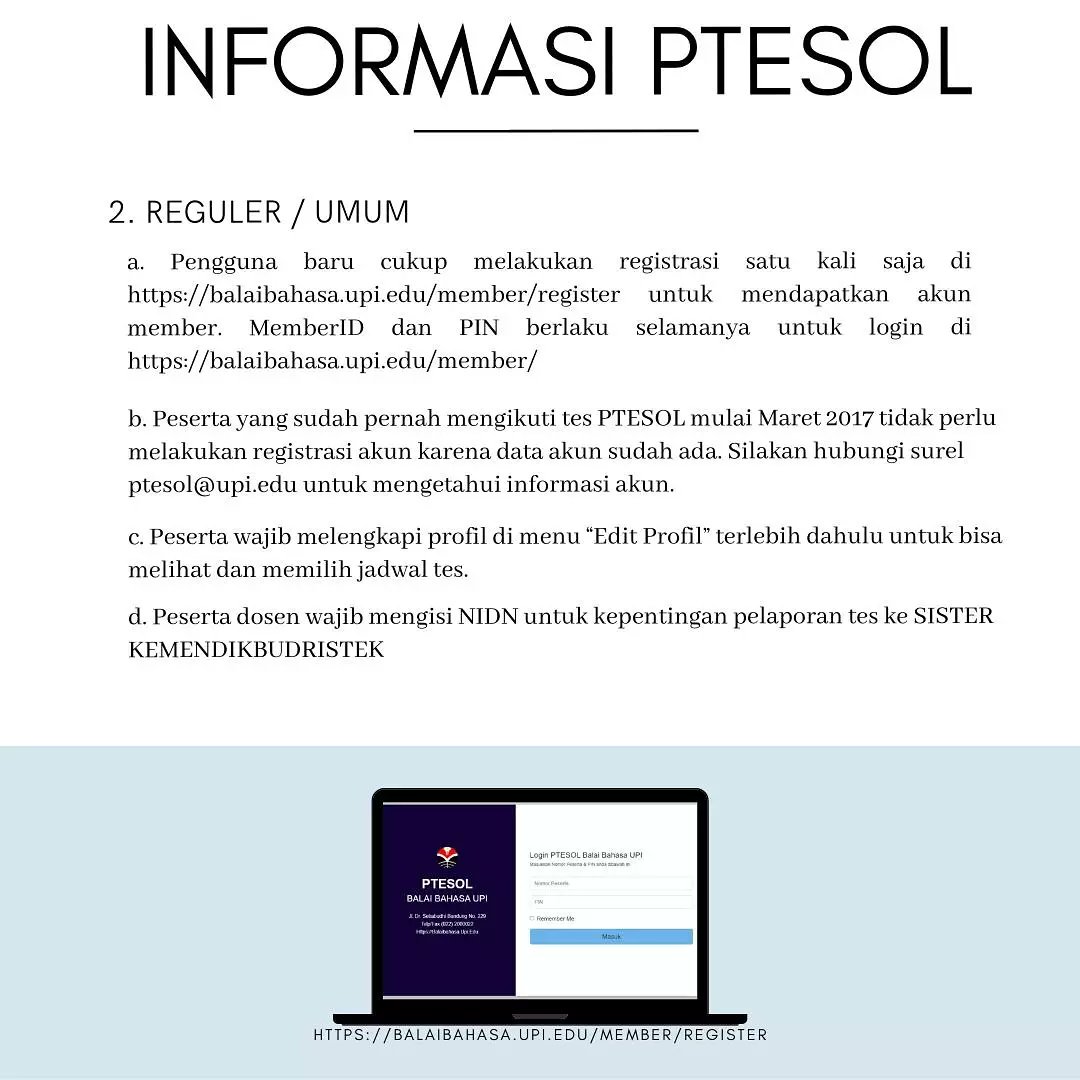 Informasi pendaftaran tes PTESOL di laman balaibahasa.upi.edu/member bagi peserta yang sudah memiliki akun dan yang baru mendaftar untuk menghindari duplikasi data.